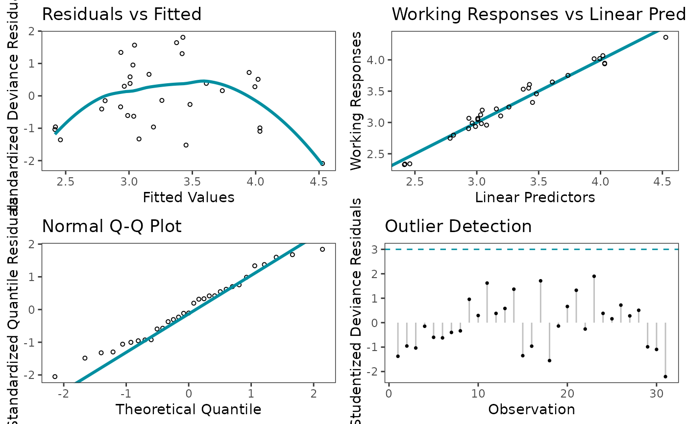 glm_diagnostic_plots(model, discrete_edm = FALSE, which_plots = 1:4)